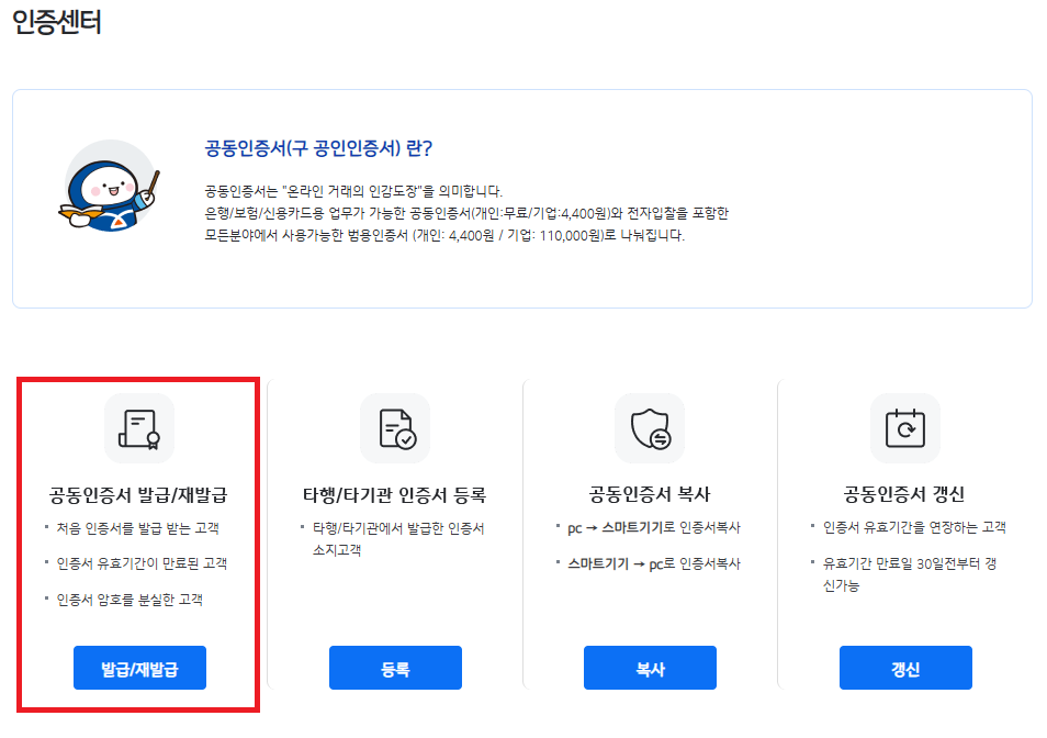 - 인증센터 또는 공동인증서 발급 메뉴 선택