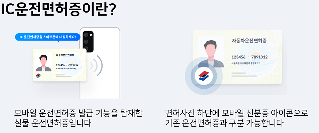 IC 칩이 내장된 운전면허증으로, 모바일 운전면허증을 비대면으로 발급받을 때 필수입니다. 기존 운전면허증과 동일한 기능을 가지면서도 NFC 기능을 활용해 모바일과 연동이 가능합니다.