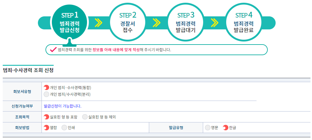 범죄경력 조회는 본인의 범죄 이력(전과 기록 포함)을 확인하는 절차입니다.