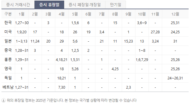 - 휴장일: 법정 공휴일 및 주요 국가 행사일 (대통령 선거일 포함)