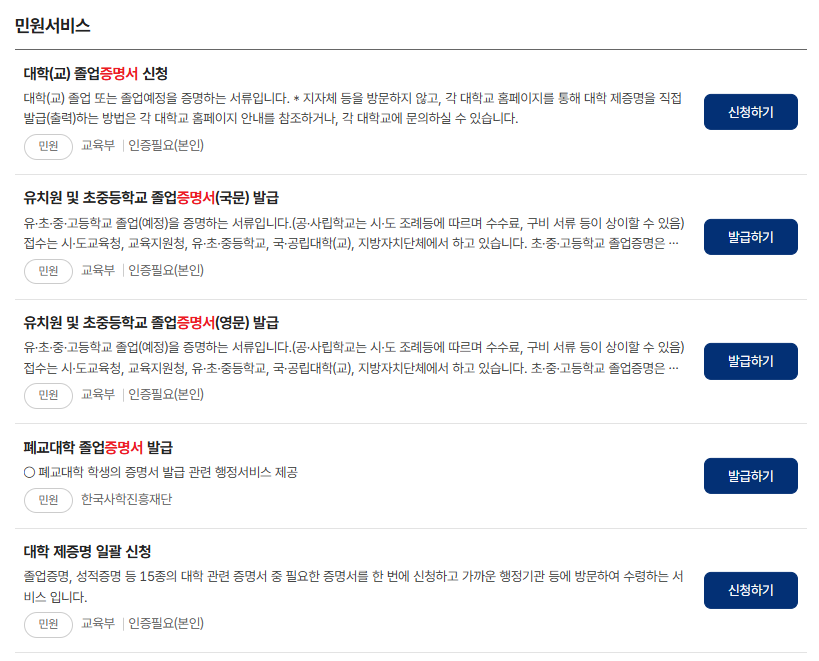 - 상단 검색창에 "졸업증명서" 입력 후 검색